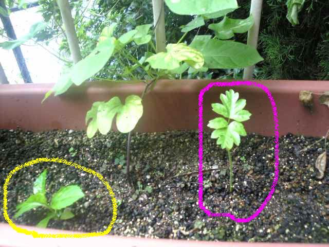 朝顔の根元に7月末に蒔いたフウセンカズラ(右の赤丸)が発芽したよ。
