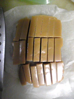 拍子抜けするほど簡単。材料を小鍋に入れてキャラメル色になるまでぐるぐる混ぜて、お弁当箱に流し込んで冷まして、切って、包んでみました。