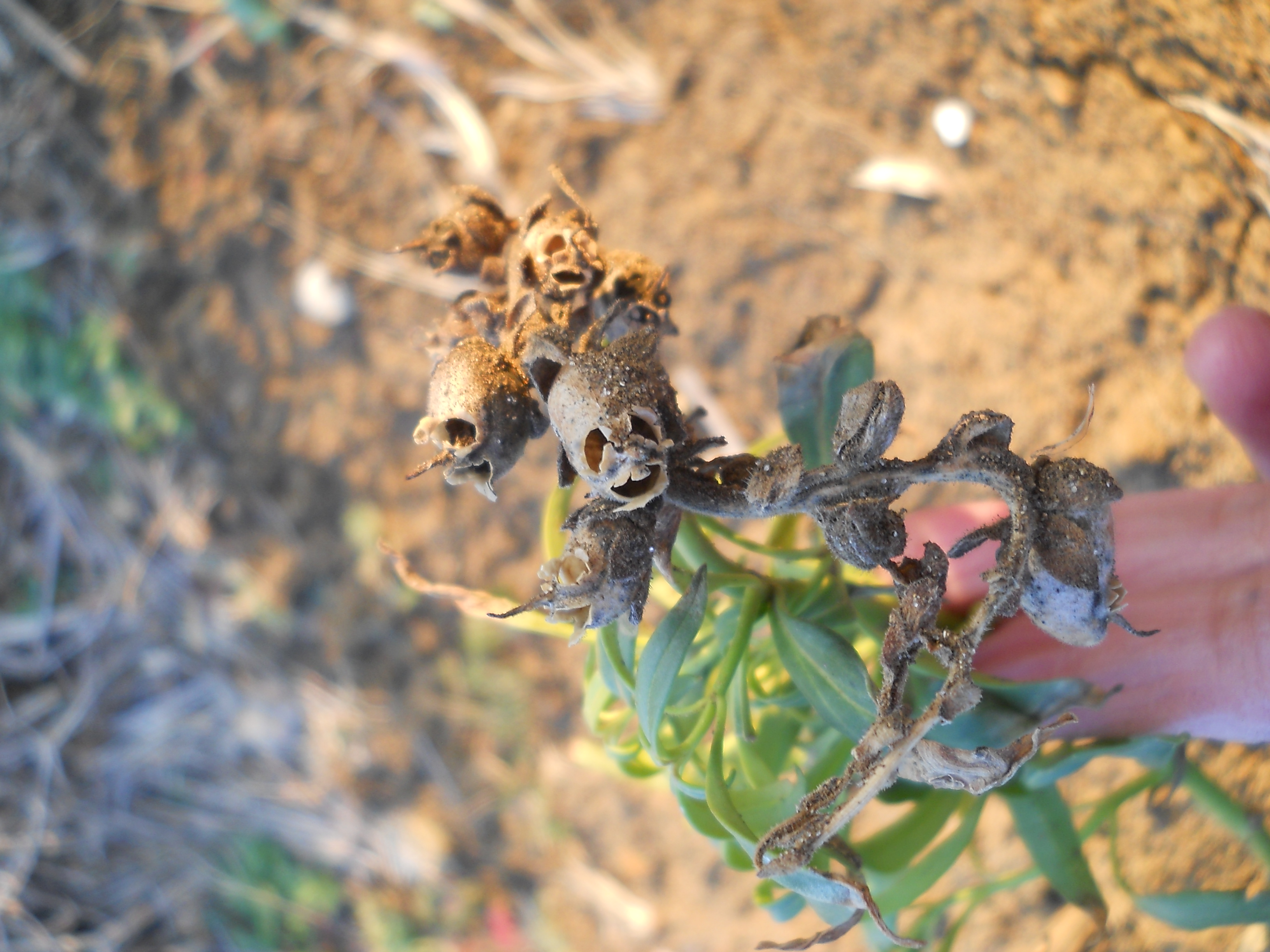 ベランダから畑に移植したキンギョソウに種が出来ていました。