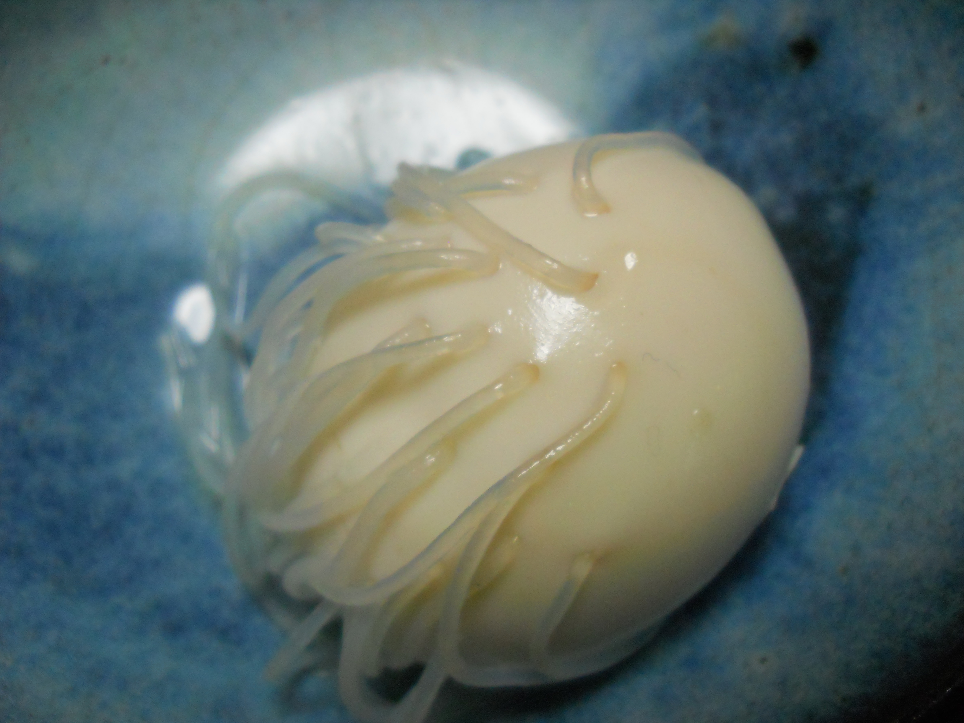 ゆでた玉子のカラをむき、短く切った春雨を刺してからおでんに入れて煮ると、根っこが生えたようになります。 私が考案したわけではありませんが、お試しあれ。