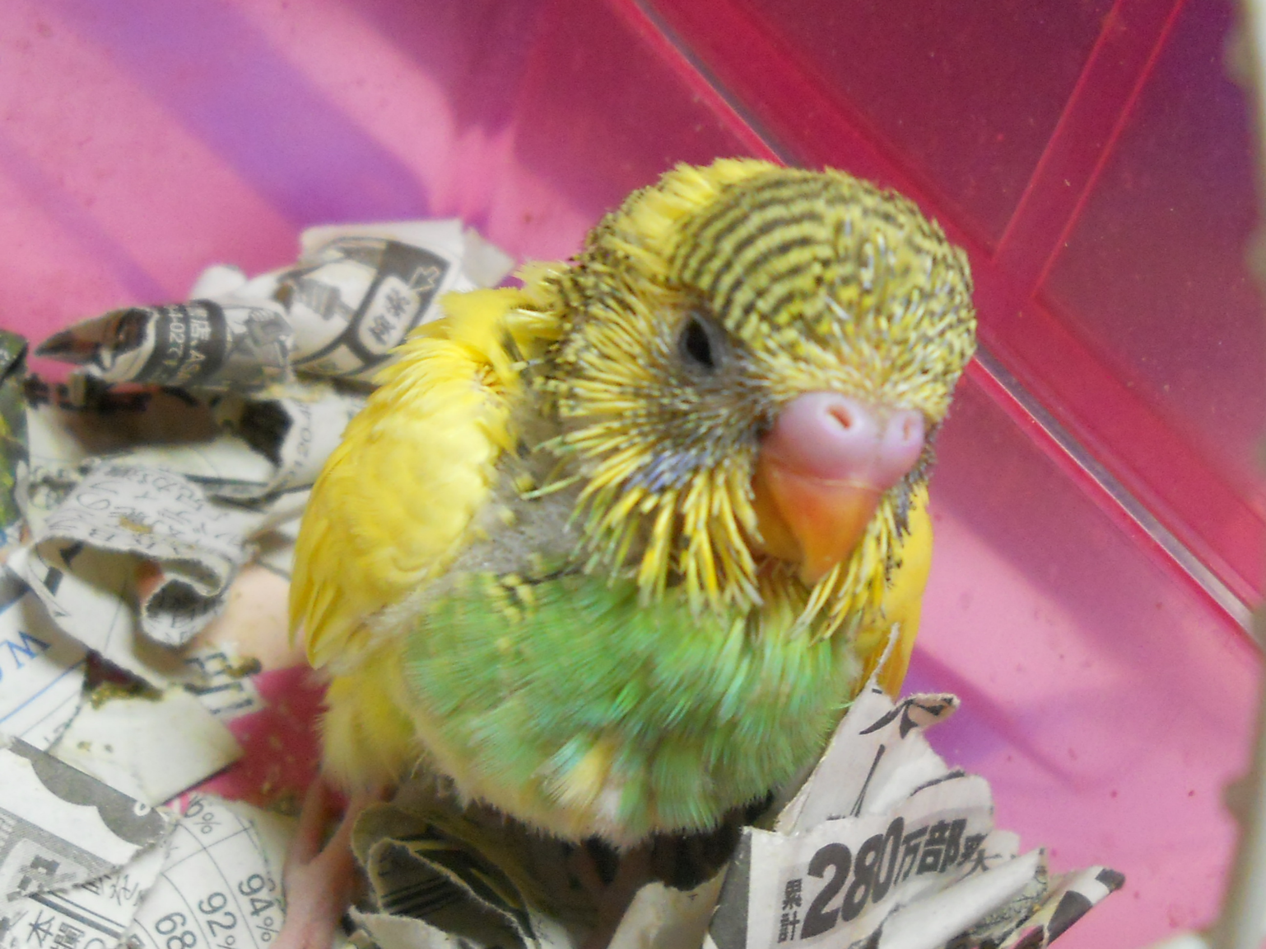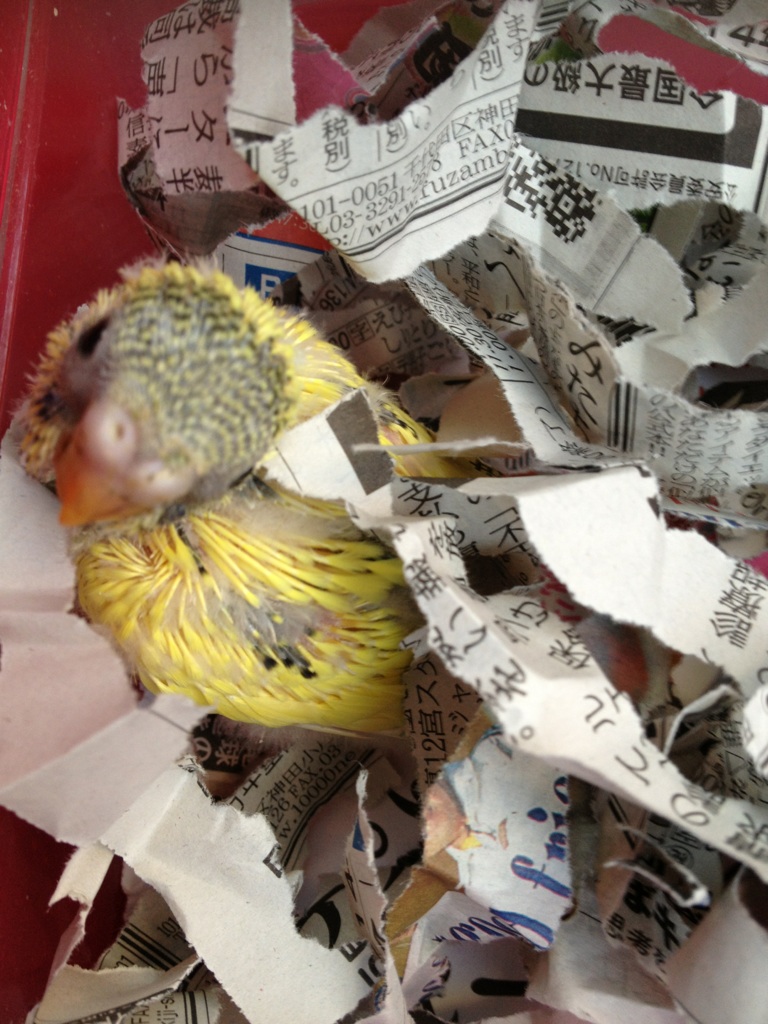 ごはん食べてウンチして寝て鳴いて、見る見る成長していきます。 写真をクリックして大きくしてね。胸と背中は黄緑、目の下は青くなってきました。