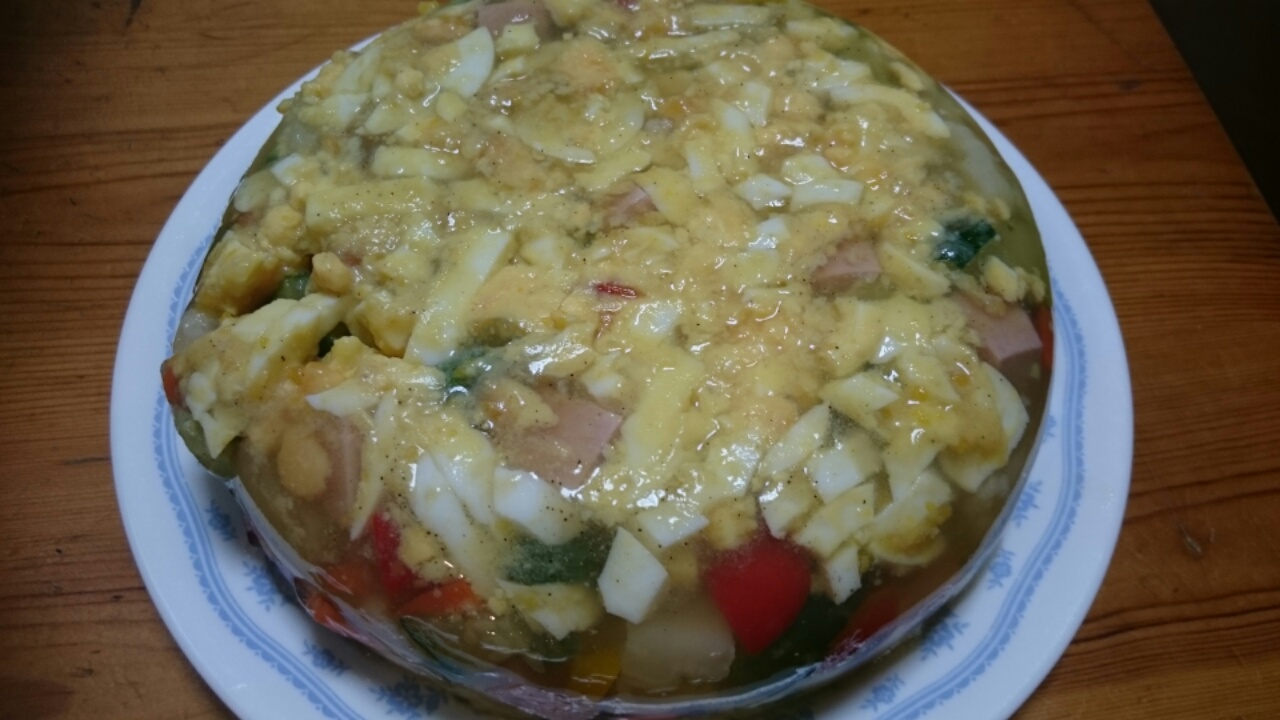 7月21日はオットの誕生日でした。とくにゴチソウではないけど、ゆで卵と夏野菜の寒天寄せを作りました。