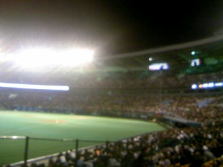スタジアムの芝の上にはチアリーダーがいるだけ。皆で正面の大型ビジョンを観ています。でも攻撃の時には立ちあがり、目の前で試合が行われているかのように大声援です。もちろん、ソフトバンクの応援席もあり、満席だったそうです。