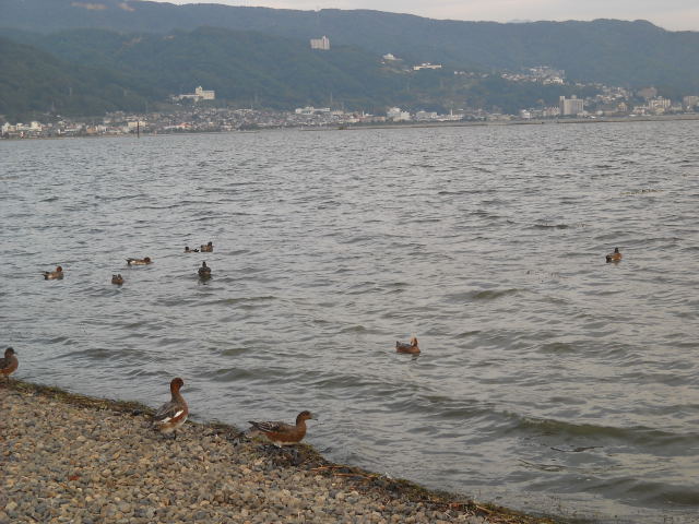 諏訪湖にはカモがいっぱいでした。