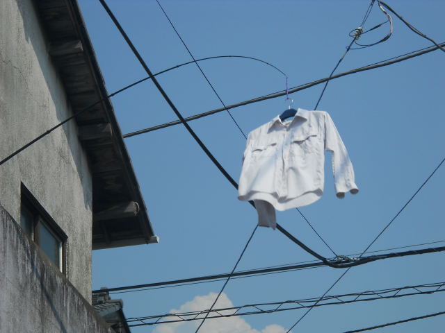 よく見ると、2階の窓から釣竿が出ていて、その先にハンガーを吊るし、シャツを干しています。
