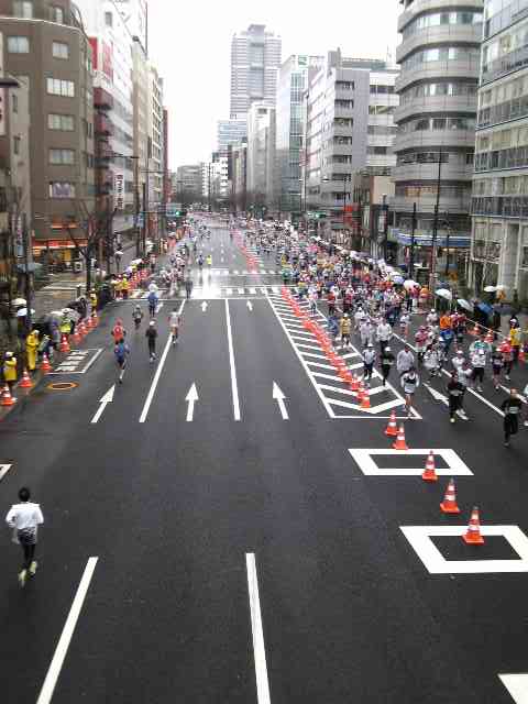 スタート地点の新宿、25キロ地点の日本橋、ゴールのお台場、と移動しながら見てきたよ。写真は日本橋浜町あたり。こっちに向かって来る人たちと、折り返して去って行く人たちがわかるかな。