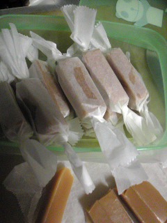 拍子抜けするほど簡単。材料を小鍋に入れてキャラメル色になるまでぐるぐる混ぜて、お弁当箱に流し込んで冷まして、切って、包んでみました。