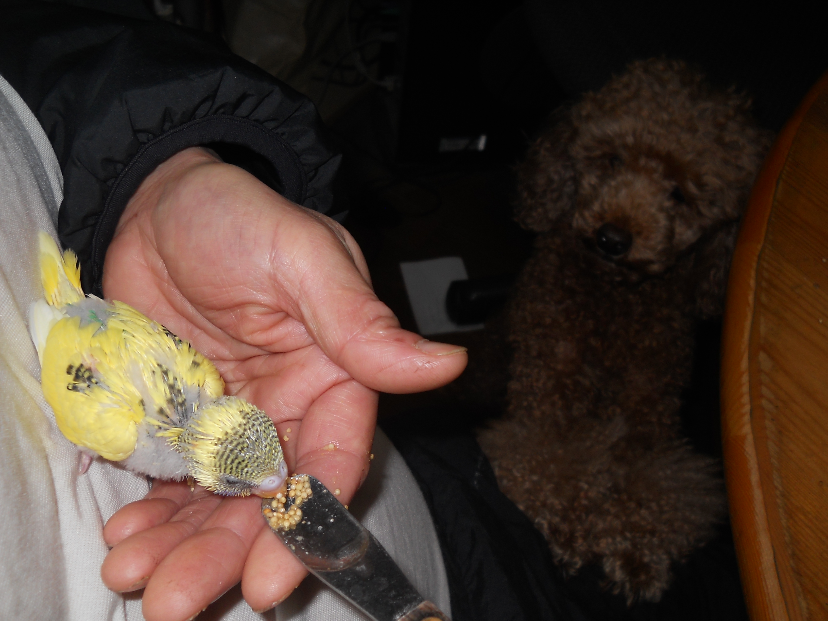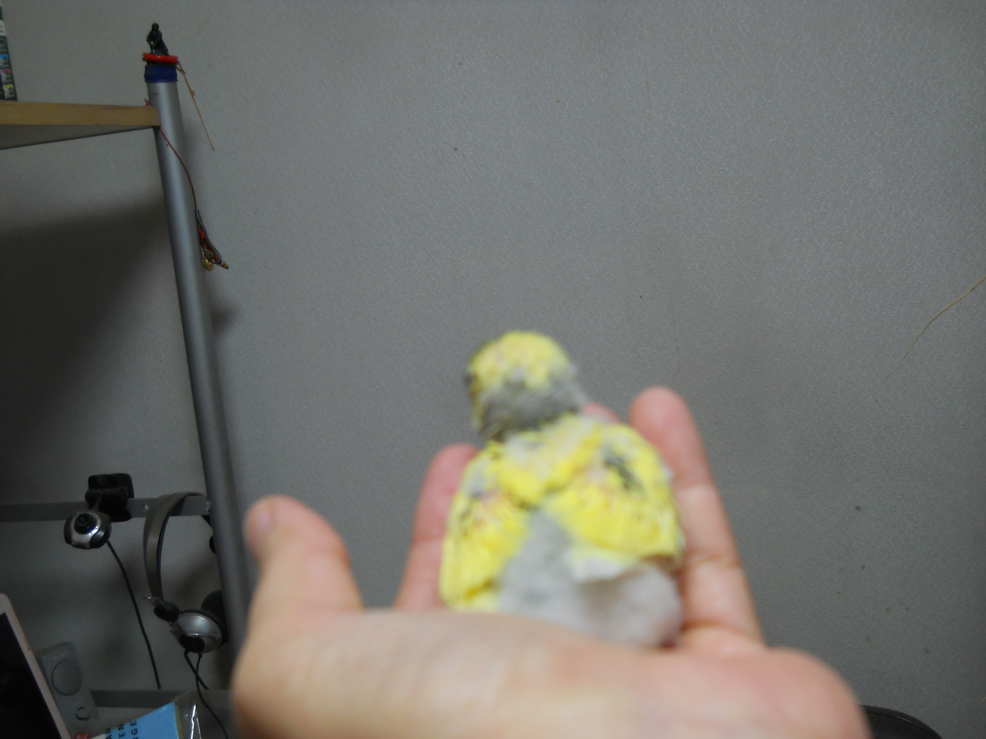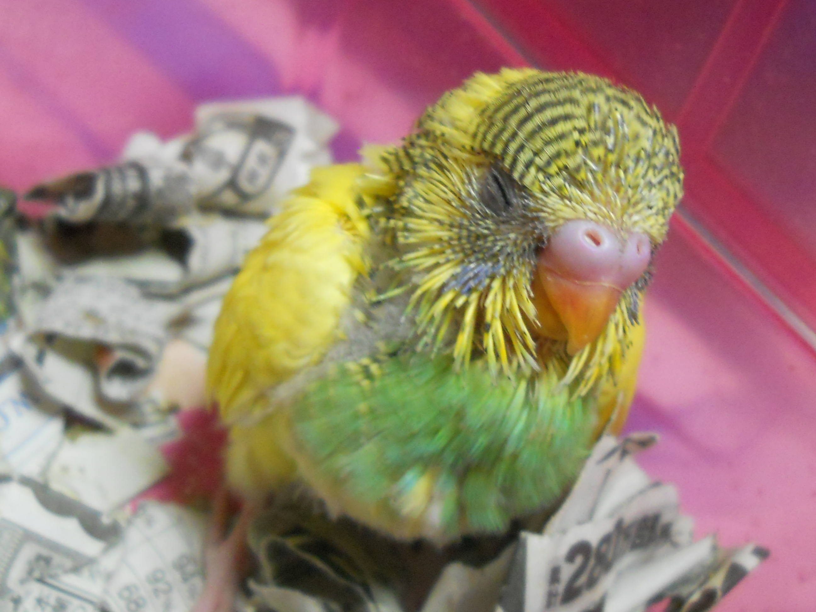 ごはん食べてウンチして寝て鳴いて、見る見る成長していきます。 写真をクリックして大きくしてね。胸と背中は黄緑、目の下は青くなってきました。