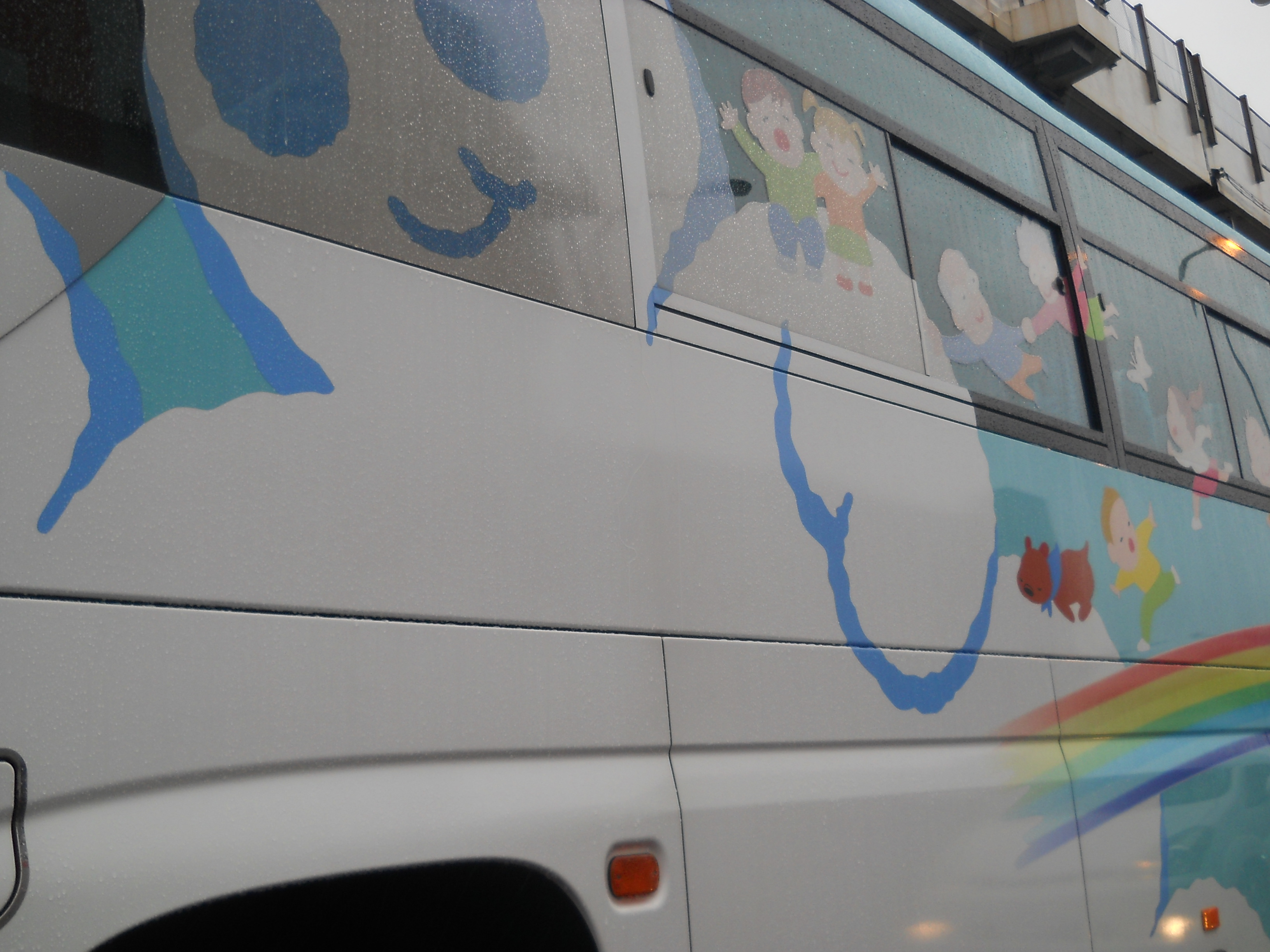 日曜日の午後、新浦安から千葉に向かっていたら、隣の車線にかわいいデザインの大型バスが。 浦安市の「きずな号」です。団体に貸出しているみたいね。