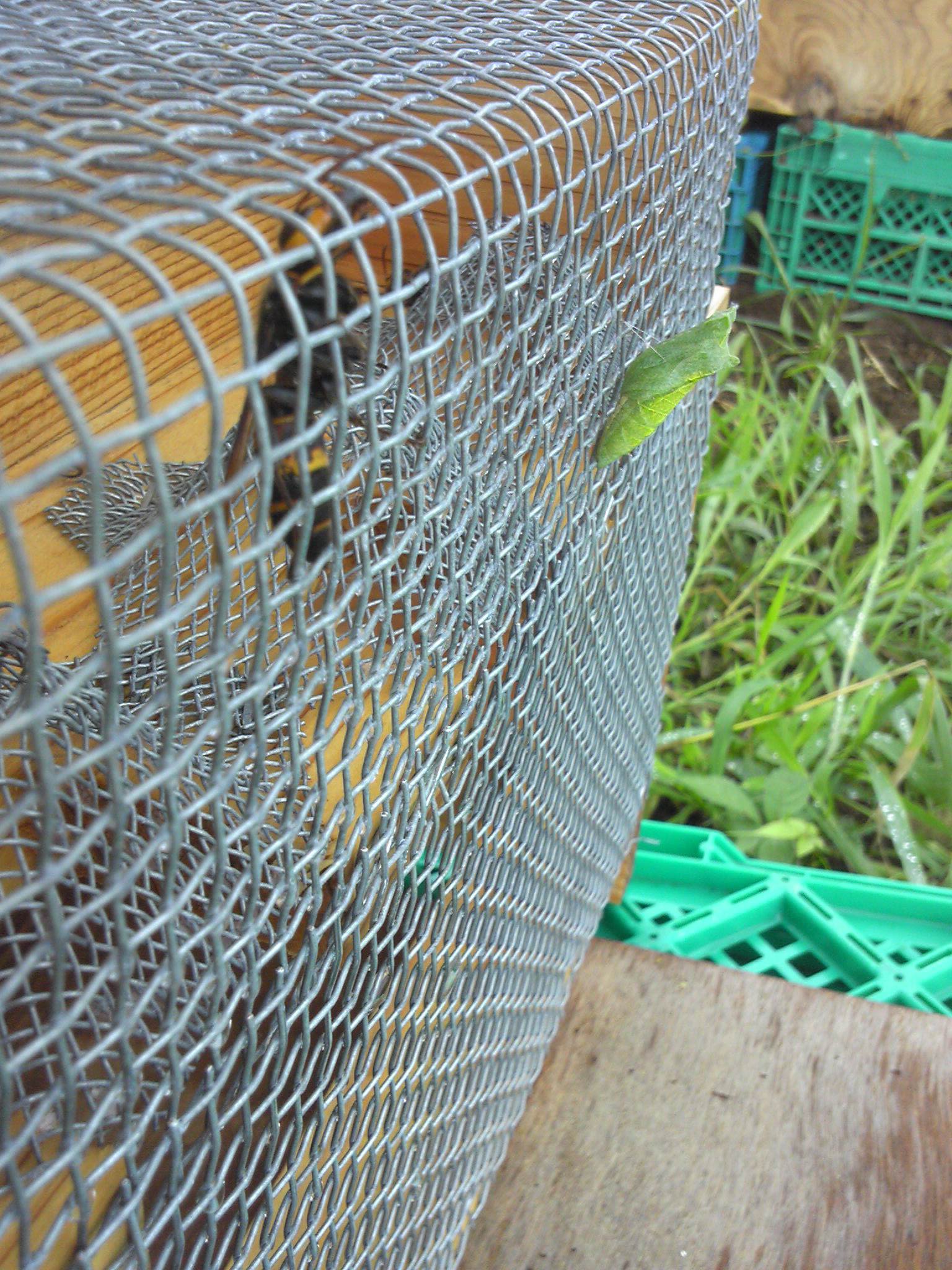 金網一枚越しにトラップに嵌ってウロウロするスズメバチ。ミツバチを狙って外にも数匹のスズメバチがホバリングしています。
