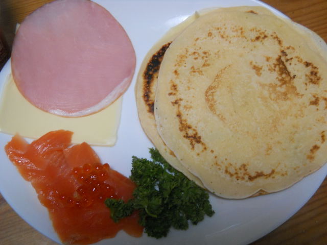 写真はブリヌイ。強力粉で作った生地を焼き、チーズやスモークサーモン、パセリ等の具を包んで食べます。このサイト(http://www.asahibeer.co.jp/enjoy/recipe/search/recipe.psp.html?CODE=0000001465)を見て作りました。美味しかったのでまた作ろう。ジャムなど甘い具でもいいかも。