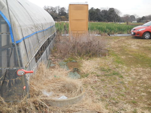 農的活動がしたくて、去年の春から土地を借りようと東奔西走してきました。本当に大変でした。やっと、このビニールハウスの脇を使わせていただけることになりました。春が楽しみです。 追記:正面は簡易トイレ、右に見えている炎の色の小型車は私の「火の車号」です。