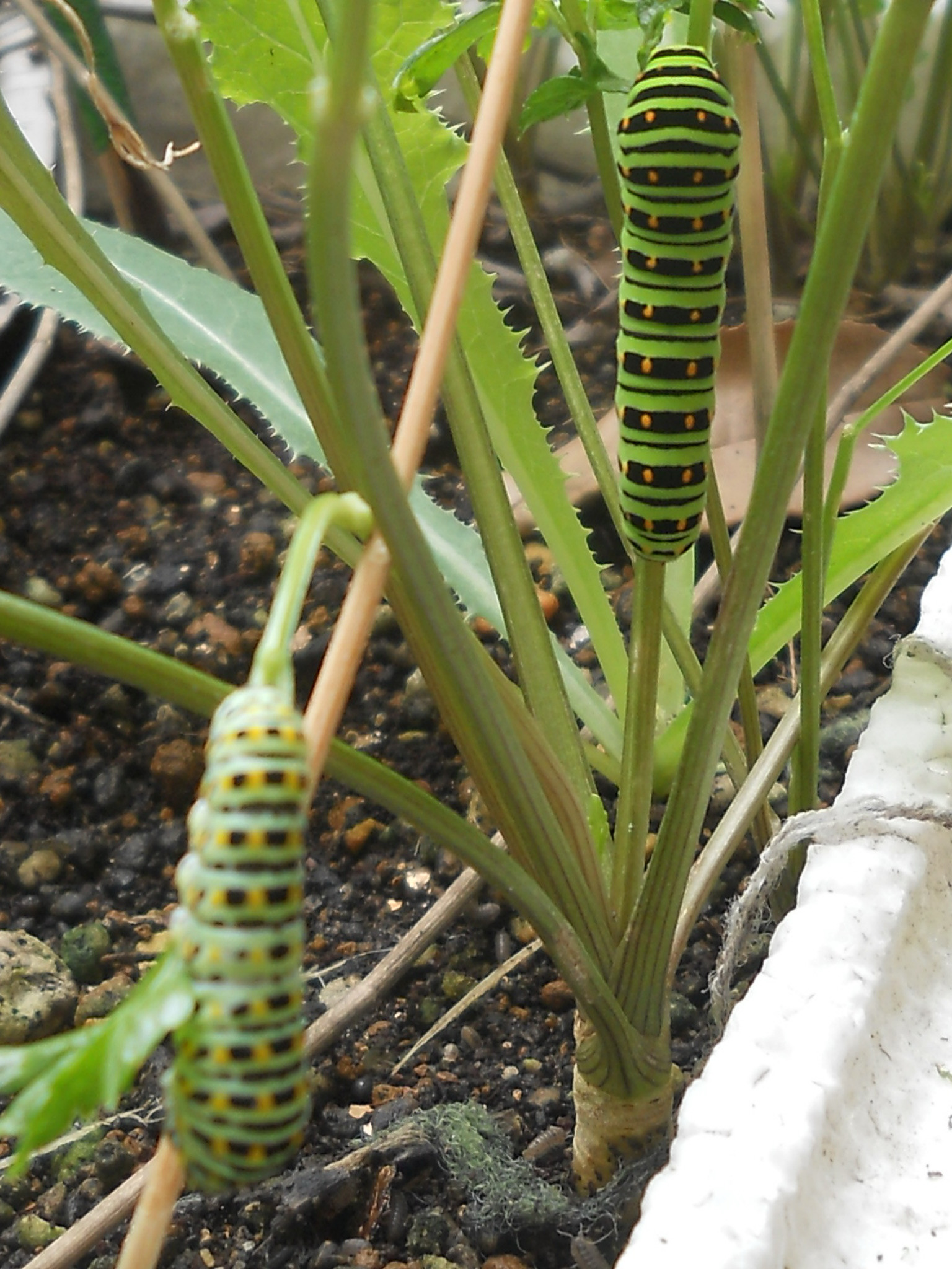 先週、ベランダにいたキアゲハの4齢幼虫と5齢(終齢)幼虫です。中学生と高校生といったところかな。虫好きさんは、写真をクリックして大きくしてもいいけど、手前の4齢ちゃんがピンボケです。