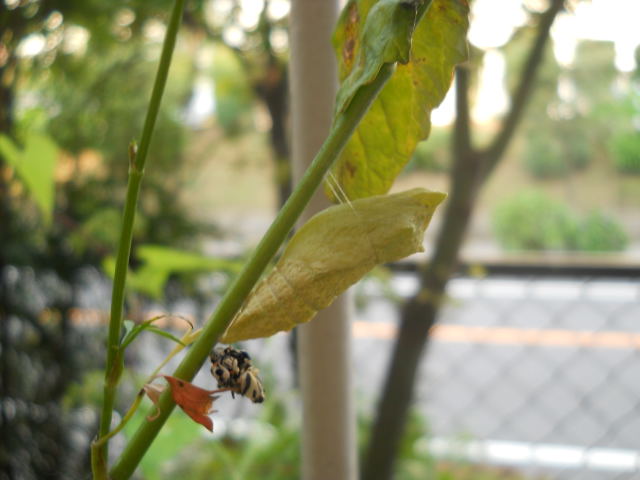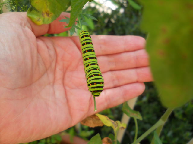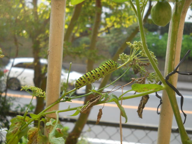 梅雨が明けて、猛暑がいきなりやってきました。暑さにめげずに、夏を楽しもうと思っています。さて、 今朝のウチの子です。 土曜日に終齢幼虫になりました。一人っ子なので、イタリアンパセリの種は独り占め。ゆっくり食べて、コロコロです。(餌が少ないと、サッサとサナギになります。) 無事にサナギになって、羽化してほしいなあ、と思っていますが・・・ この真上に、オニグモが、夜のうちに大きな巣を張り、この子が羽化するのを待っている!キアゲハの運命やいかに! 続く。