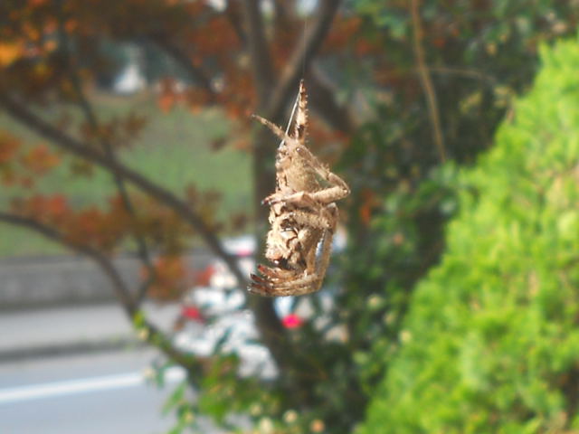 (虫好きさんは写真をクリック。大きくして、キアゲハの点々やクモの脛毛のトゲトゲを見てね。) 無心にイタリアンパセリの種や葉を食べるキアゲハ王子(性別は不明ですが)。 蝶になったら獲って喰おう、と虎視眈々と狙う老獪なオニグモ。 などと妄想を楽しんでいますが、実際はお互いの存在に気付いていないでしょう。そして、今朝はオニグモの巣は張られていませんでした。昨日の昼間、引っかかった小虫もろとも撤収し、今朝はベランダの天井の溝でじっとしていました。(オニグモは、自分で巣を撤収するそうです。見たいね。) 両者の運命はいかに? 続く!