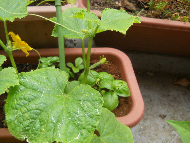 DSCN2038.JPG今朝のベランダ菜園のキュウリです。手前の葉に、テラテラとナメクジの足跡