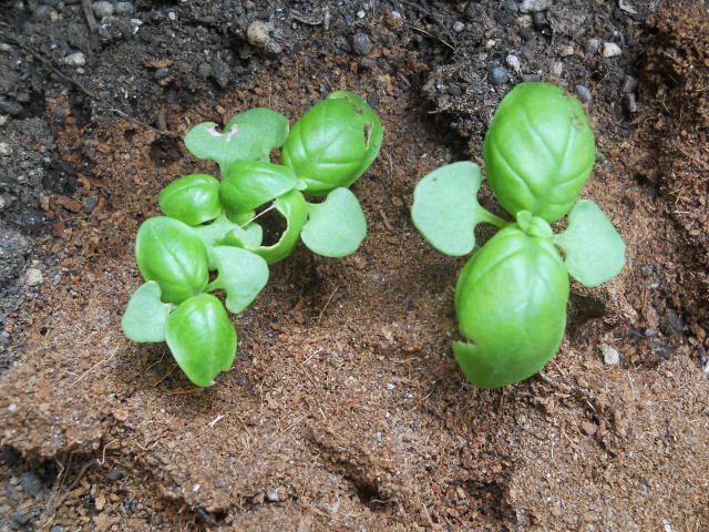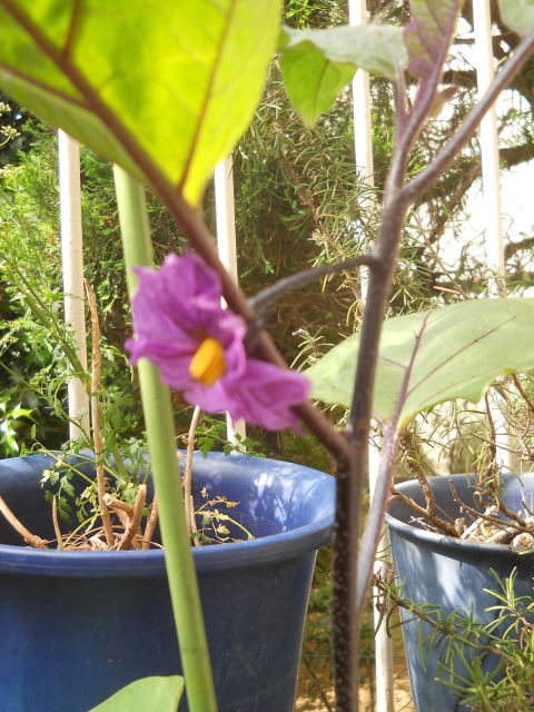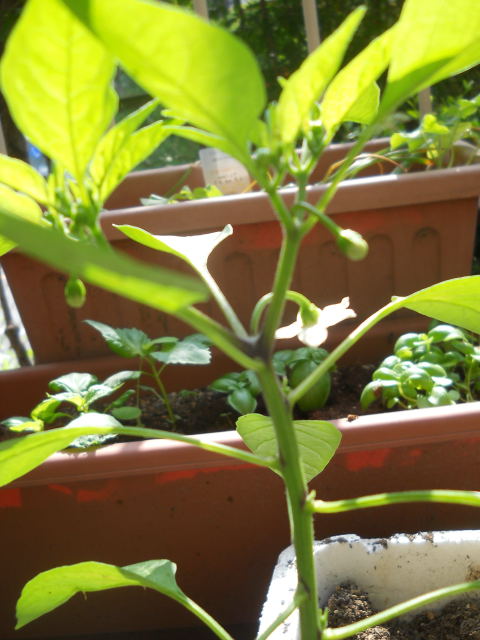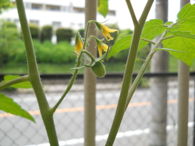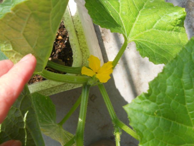 5月半ばに買った野菜の苗たちに花が咲き始めています。 左はナス、右はシシトウ。シシトウの花は小さいので、写真をクリックして大きくしてね。後ろにシソとバジルも育っているのが見えます・・・むしろ、そちらにピントが合っています キュウリの花も咲きました。 これは多分雄花でしょう。こんな根元にキュウリは実らないと思うので。