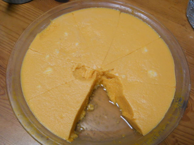 DSCN1612.JPG南瓜400g、牛乳、生クリーム各100ml、砂糖70g、卵3個を混ぜて、レンジで蒸し焼き。