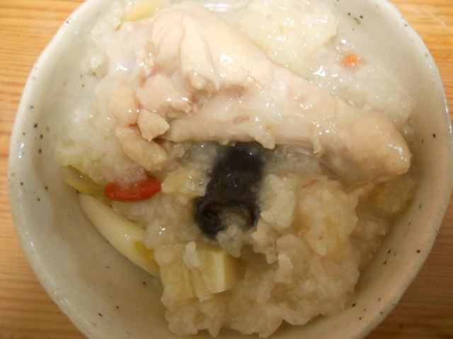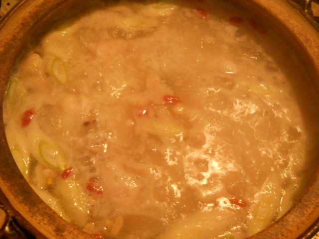 土鍋に、骨付き手羽元5本、もち米1カップ、長ネギ1/2本、ニンニク2片、ショウガ1片、干しナツメ1個、クコの実、松の実少々、水1リットル、塩、コショウ少々を投入。(量は全てテキトー。)