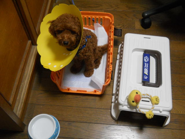 DSCN0775.JPGしんどいから巣穴(キャリー)でくつろごう、でもエリザベスカラーがジャマで入れない。ボーっとキャリーの前に立っていたので、蓋を外したらヨロヨロ入って座っています。哀れすぎる