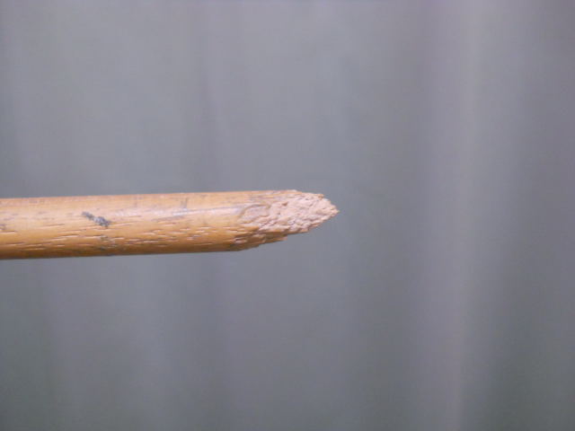 中央の木の部分をが毎日齧るので、唾液で柔らかくなり、木の繊維がほどけてきています。スルメのようだ。