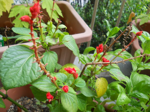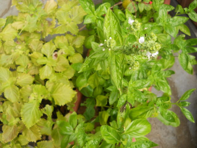 顔色の冴えないシソ、と、花の咲いたバジル。