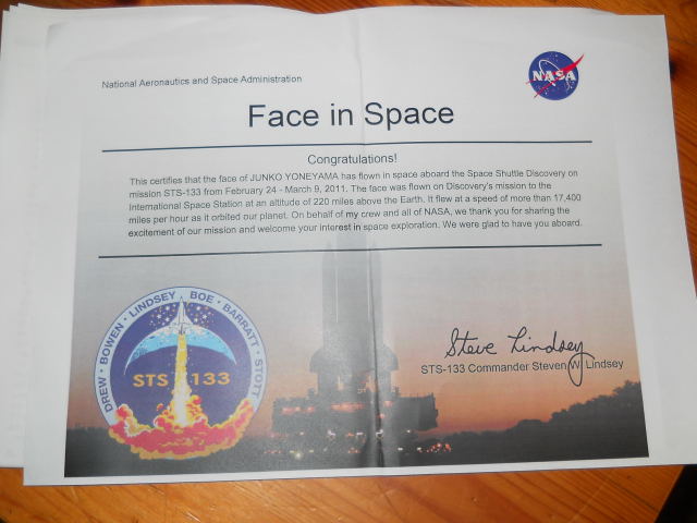 去年、「写真なら宇宙へ行けます」というNASAのプロジェクトに参加した、という記事を書きました。これです。もう一年以上前だったんだね。そして、11月予定のエンデバー打ち上げが伸びに伸びて今年の2月24日でした。宇宙へ行って無事に帰還した(写真だけね)証明書が発行されるんだったな、と、ふと思い出し・・・・忘れていたわけではないけど、震災とかイロイロあったからね。