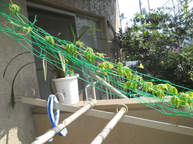 DSCN0709.JPG緑のカーテンと言うには葉がまばら。ゴーヤはなぜか雄花しか咲かず、実は出来ない様子。これも肥料をやらねば。