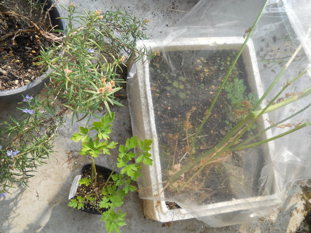 ネットをかぶせられ、キアゲハ保育園と化しているトロ箱ハーブ園。外にあるのは2度目の「おかわり」のイタリアンパセリ。
