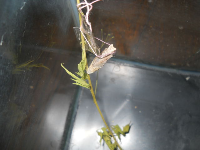 蛹の上半身を固定していた糸が切れて、お尻だけ茎につけて逆さ吊りに
