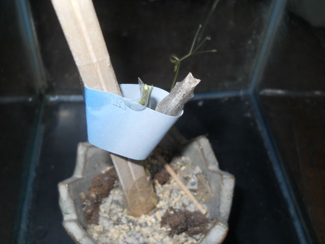 DSCN0732.JPGお尻の先はフウセンカズラの茎にくっついているので、茎ごと下半身を付箋でくるみ、テープで割り箸に固定しました。