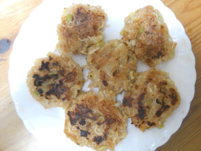刻んだ干しエビ大匙4を1カップくらいのお湯に浸し、切り干大根40グラムも入れます。そこに白玉粉200グラムを入れて、耳たぶくらいの固さになるように、水を加えて調整します。刻んだネギと塩少々入れて、適当な大きさに丸めて、フライパンで焼きます。できあがり。お醤油をつけてどうぞ。中華風味なので、ラー油もあるといいかも。