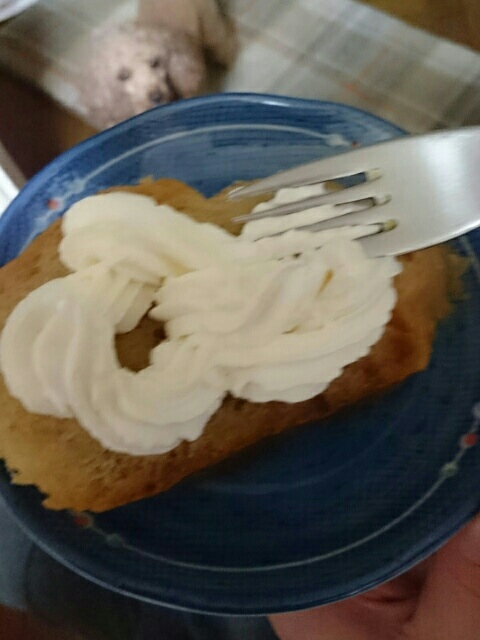 夫が食べているのは、フランスパンをシロップに浸したものに生クリームをのせた「サバラン」です。いわばジェネリックケーキですね。