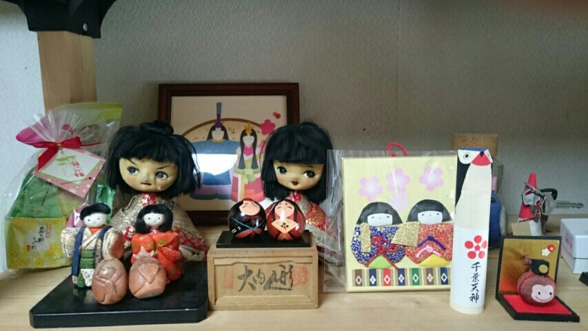 お雛様かざっています。写真をクリックして大きくしてください。いつものメンバーに、去年から父がリハビリ施設で作った色紙に貼ったペアも加わりました。絵心が無いので、扇が変な所にあります。その前に立っているのは「うそ」です。夫が買ってきました。年々「鷽替え神事」で大きくしていくんでしょうね。一番小さいのからスタートしたかったけど売り切れでこれ。二千円です。鷽替え積立しておかないと。