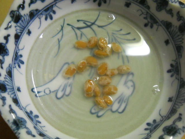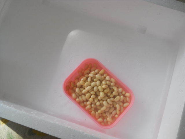 茹でた大豆が熱いうちに、納豆菌抽出液を混ぜ、発泡スチロールのトロ箱に熱めのお湯を張り、タッパーに入れた大豆を浮かべ、ふたをして毛布でくるむ。