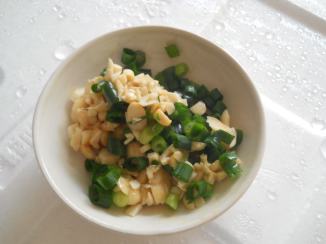 そのままだと粒が大きすぎるので、引き割って万能ねぎを入れた。普通に納豆だ。